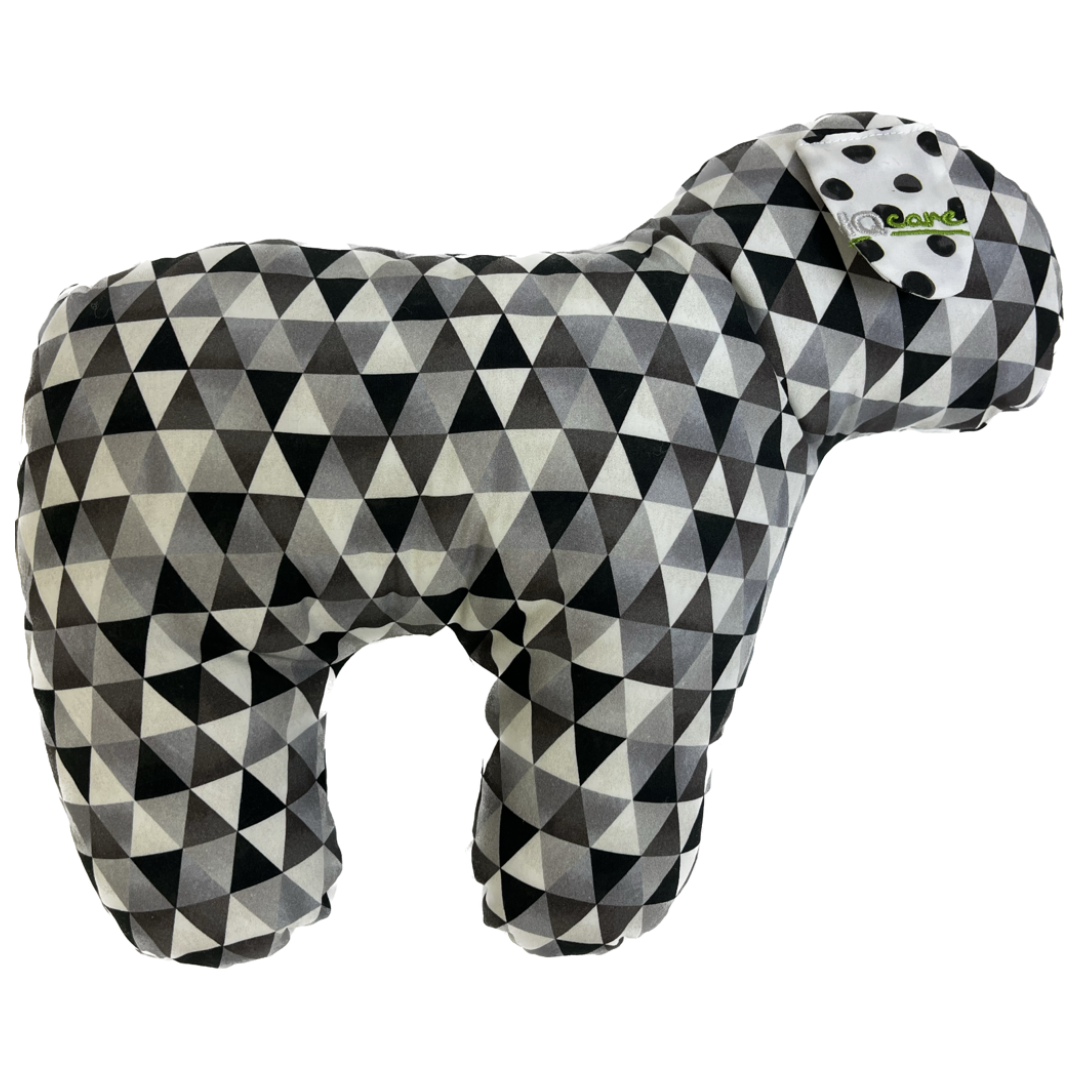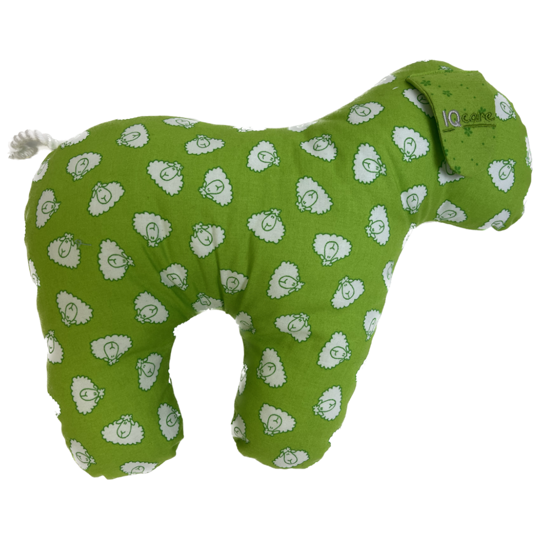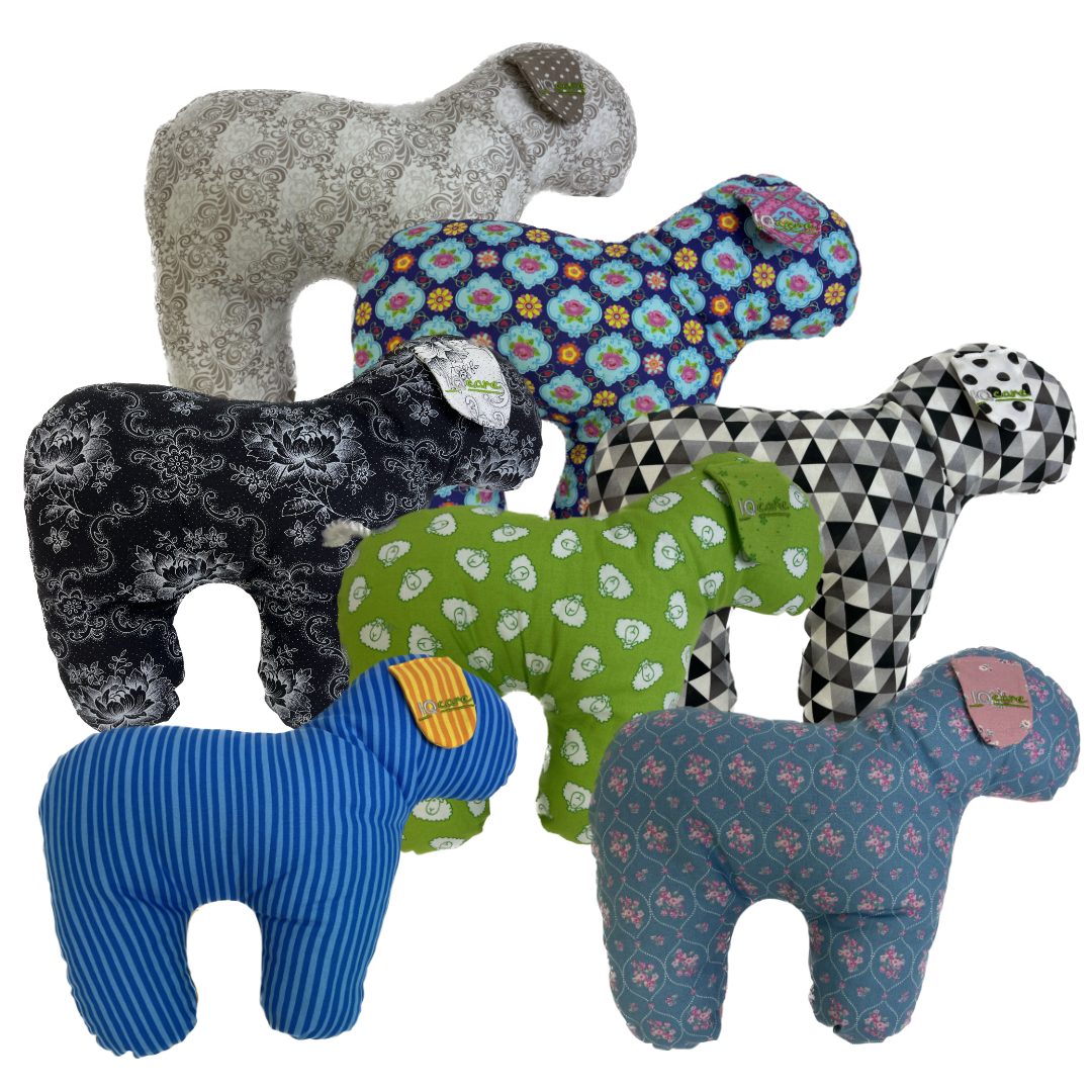Jedes Schäfchen ist aus zwei aufeinander abgestimmten Stoffen genäht und ein Hingucker, mit hochwertigem IQcare Logo-Stick auf dem rechten Ohr.